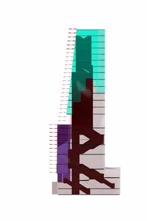 Functional distribution: The main hall for special events is located in the basement (largish floor area, conical profile), the exhibition spaces extend upwards over two stories like a gallery. The film and video projection story and the library have platforms. The story for seminars and the open space close vertically the development of the base. This seperates the public stories from the office and residential floors.