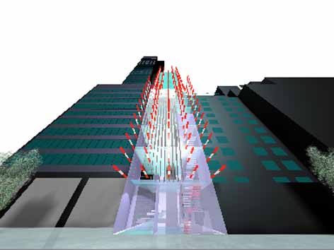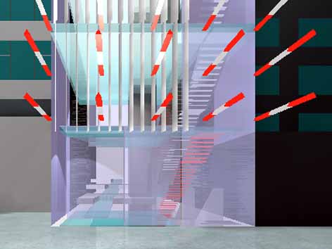 The flagpoles form a second layer which is placed in front of the structural glazing, and enhance the effect. Since the building does not want to compete with the surrounding buildings, neither in height nor in volume, the projection is emphasized as an outstanding and delicate signet, which marks a special place in the street. It's identity lies in the difference, in the extraordinary. The flagpoles moving in the wind may create an im pression as if the building itself was moving; on special occasions, the architectural effect may be enhanced by hoisting flags or creating screens which provide informfation on the content. The antenna-like symbolism is comlex.