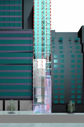 The possibility of the building code to let flagpoles project 3m beyond the facade is used; starting 4,5m above ground floor level and reaching up to the top of the building (72,93m), 185 slim flagpoles, together give an architectural form of a multiple arranged along the entire street facing facade, project into the 52nd street. The square pattern of the flagpoles is independent of the grid defined by the stories.