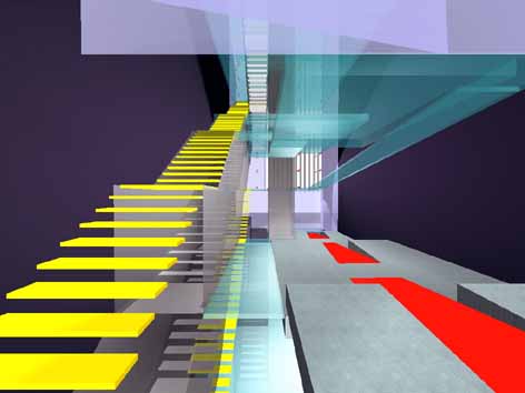 The covered fire escapes are here arranged in sequence / one on top of the other. The open staircase above and the multi-story void link to the seperate areas. The movoment through the space follows the functional link. The volume admits light from the south into the depth of the building, admits view into the building along a diagonal line right to the terrace story, and views outside as well. Conventional scissor stairs provide access to the office and residential floors.