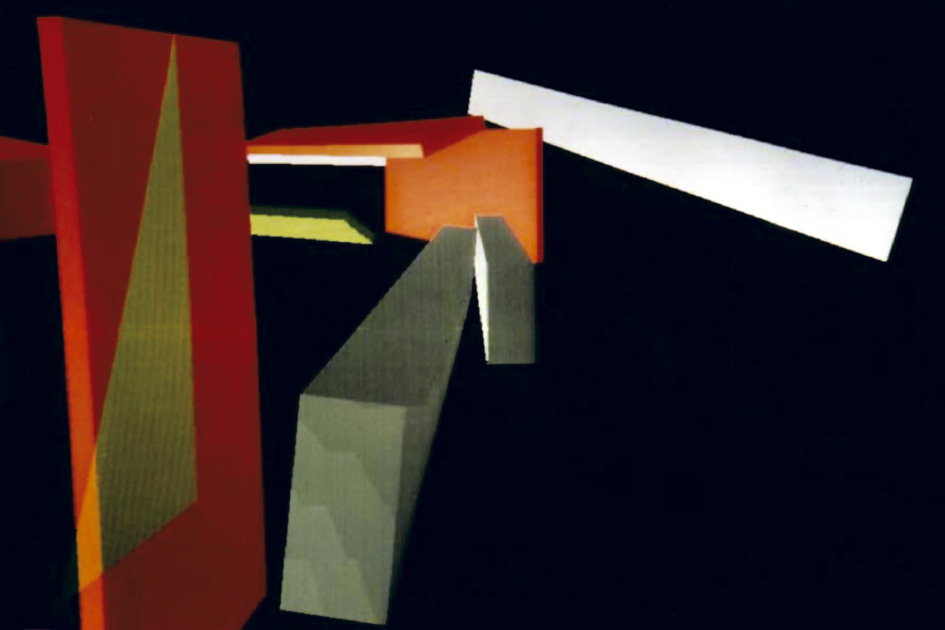 These are extracts showing the material which is all simultaneously there in the CPU. All retrieved pictures are equivalent. Plans are just as arbitrary views as certain perspectives or axonometric projections, regardless of whether they are wire-frame, hidden-line or solid. Since a large number of perspectives can be produced effortlessly the "viewpoint" in architecture disappears. The multitude of perspectives permits the dissolution of simple stereometries into complex structures.